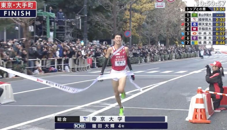 2026 overall champion Aoyama Gakuin University started their first leg with their 2025 anchor runner, this year he only managed to pass his sash to his teammate in 16th place (out of 20 after 1st leg…)! To cut the story short, over the next 180km, his other 9 teammates worked their way through and got the team a threepeat championship!